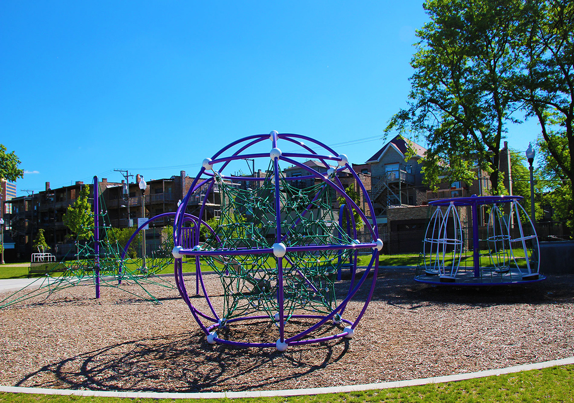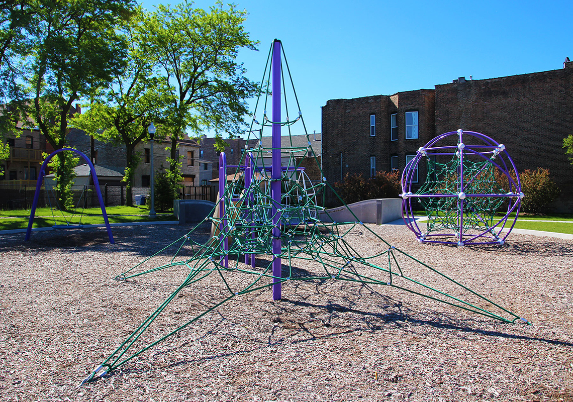 Dedicated to the memory of Hadiya Pendleton, Dynamo Playgrounds was proud to be part of this project which aimed to create a safe place in the community for children and families to spend time. It features our Biggo swing, Asteroid frame net, Genesis mast net, Nebula frame net and QuadPod rotating climber.